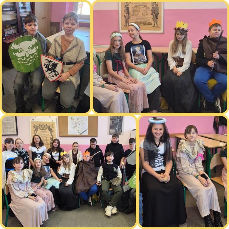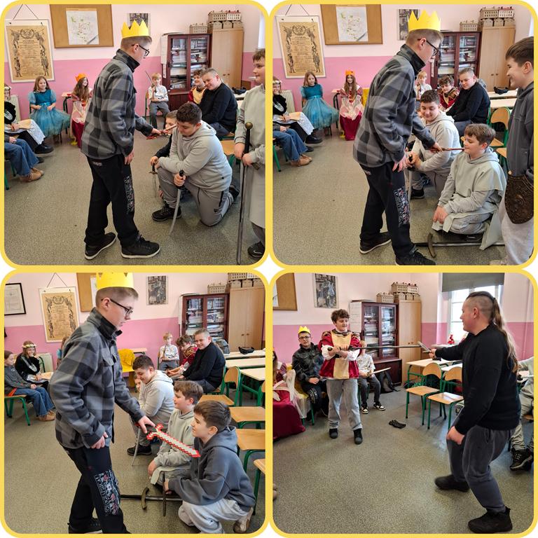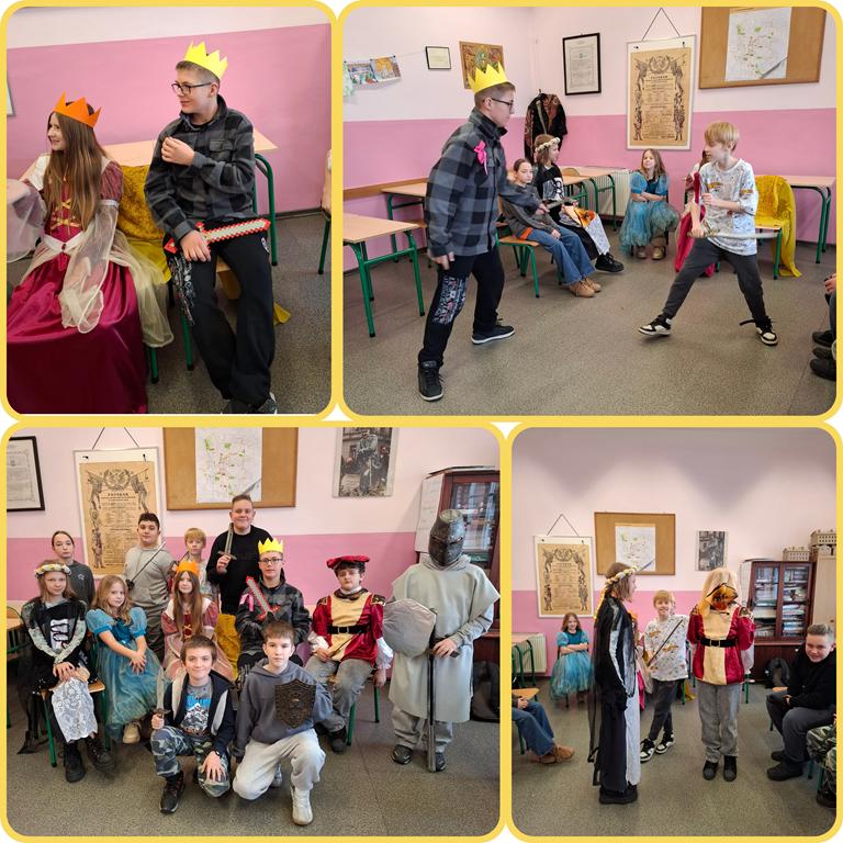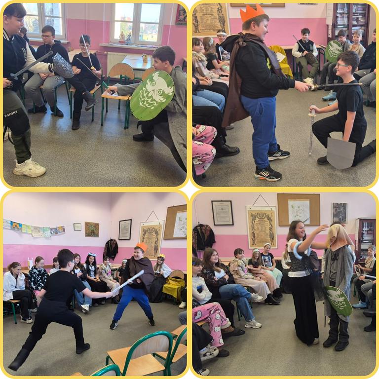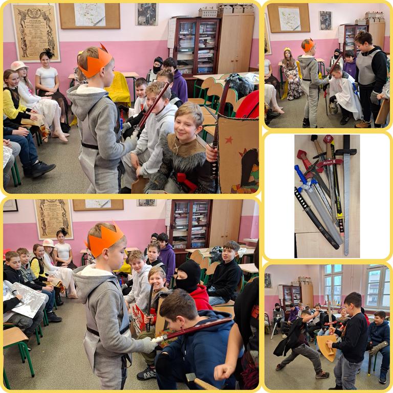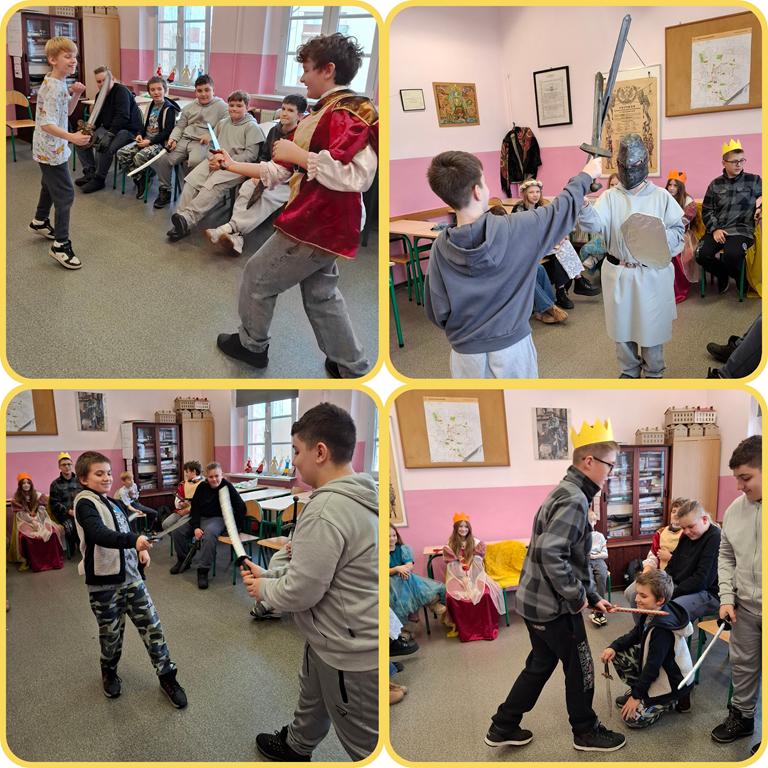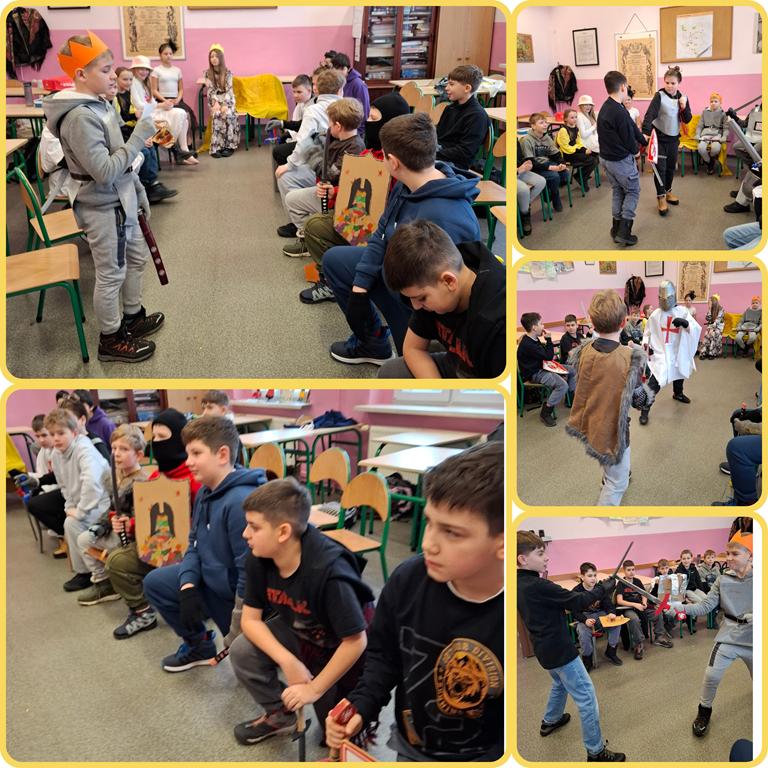 W minionym tygodniu w klasach 5 odbyły się turnieje rycerskie, w związku z realizacją działu – Społeczeństwo średniowiecza. Uczniowie wcielili się w damy dworu oraz rycerzy i odegrali różne obyczaje rycerskie. Było między innymi pasowanie, rzucanie rękawicy, pojedynki, narzucanie nałęczki. Uczniom lekcja bardzo się podobała, a wiedza zdobyta w ten sposób na pewno na długo pozostanie w ich pamięci.