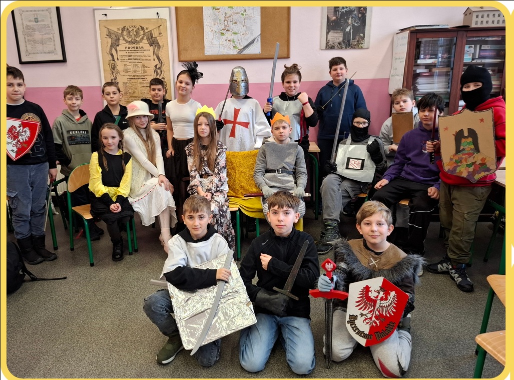 W minionym tygodniu w klasach 5 odbyły się turnieje rycerskie, w związku z realizacją działu – Społeczeństwo średniowiecza. Uczniowie wcielili się w damy dworu oraz rycerzy i odegrali różne obyczaje rycerskie. Było między innymi pasowanie, rzucanie rękawicy, pojedynki, narzucanie nałęczki. Uczniom lekcja bardzo się podobała, a wiedza zdobyta w ten sposób na pewno na długo pozostanie w ich pamięci.
